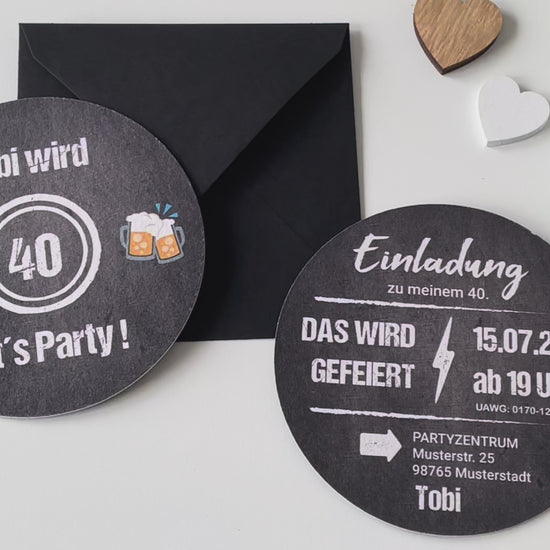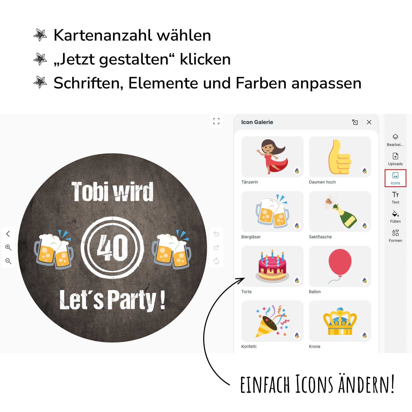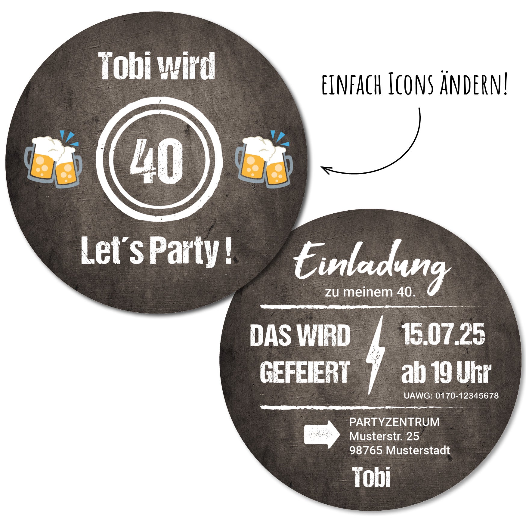 Runde Bierdeckel Einladungskarte zum 40. Geburtstag: Let´s Party! 🥂😀🎉