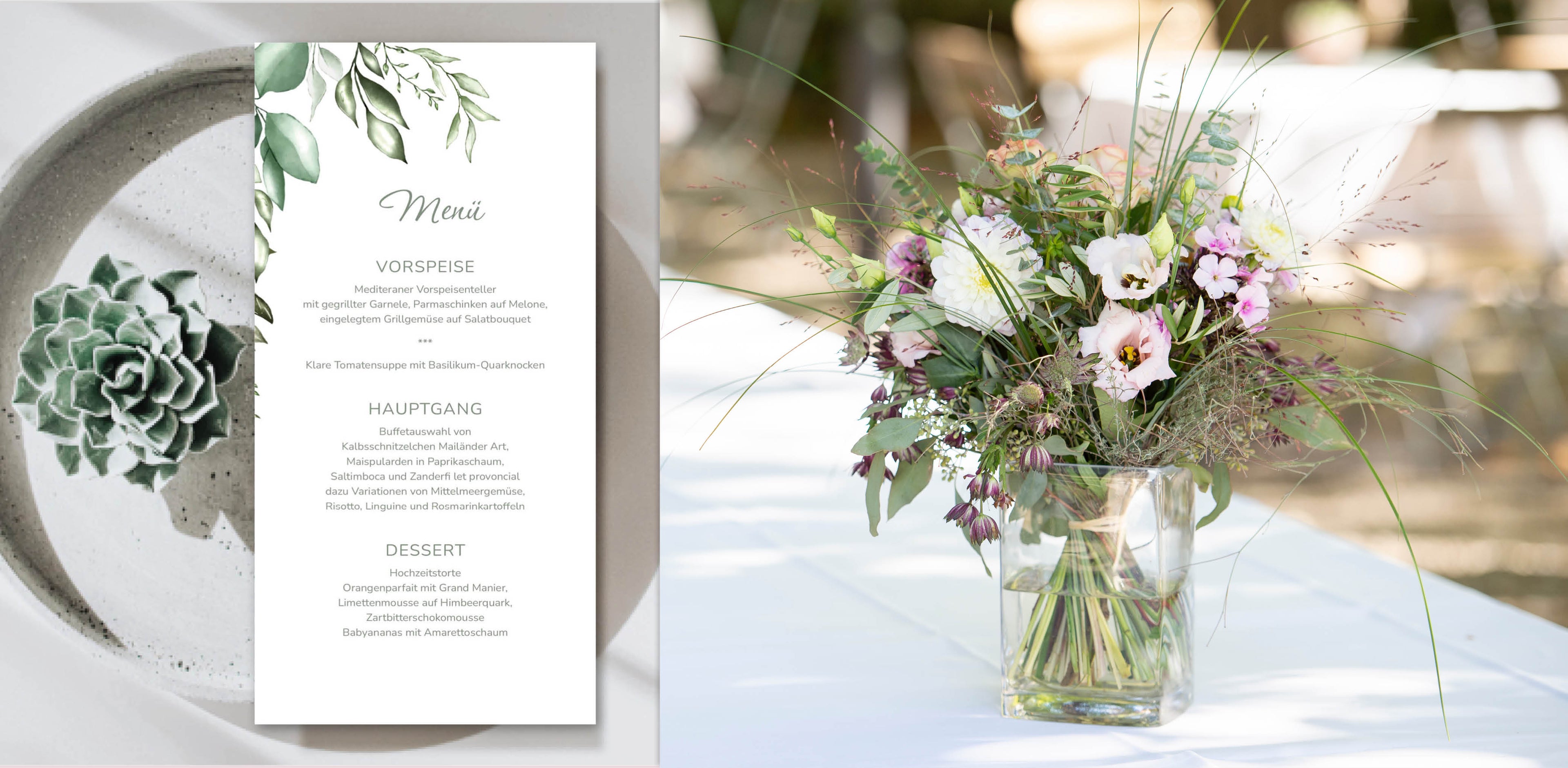 Ob Hochzeit, Geburtstag oder Taufe – Eure Menükarten setzen kulinarische Highlights perfekt in Szene!