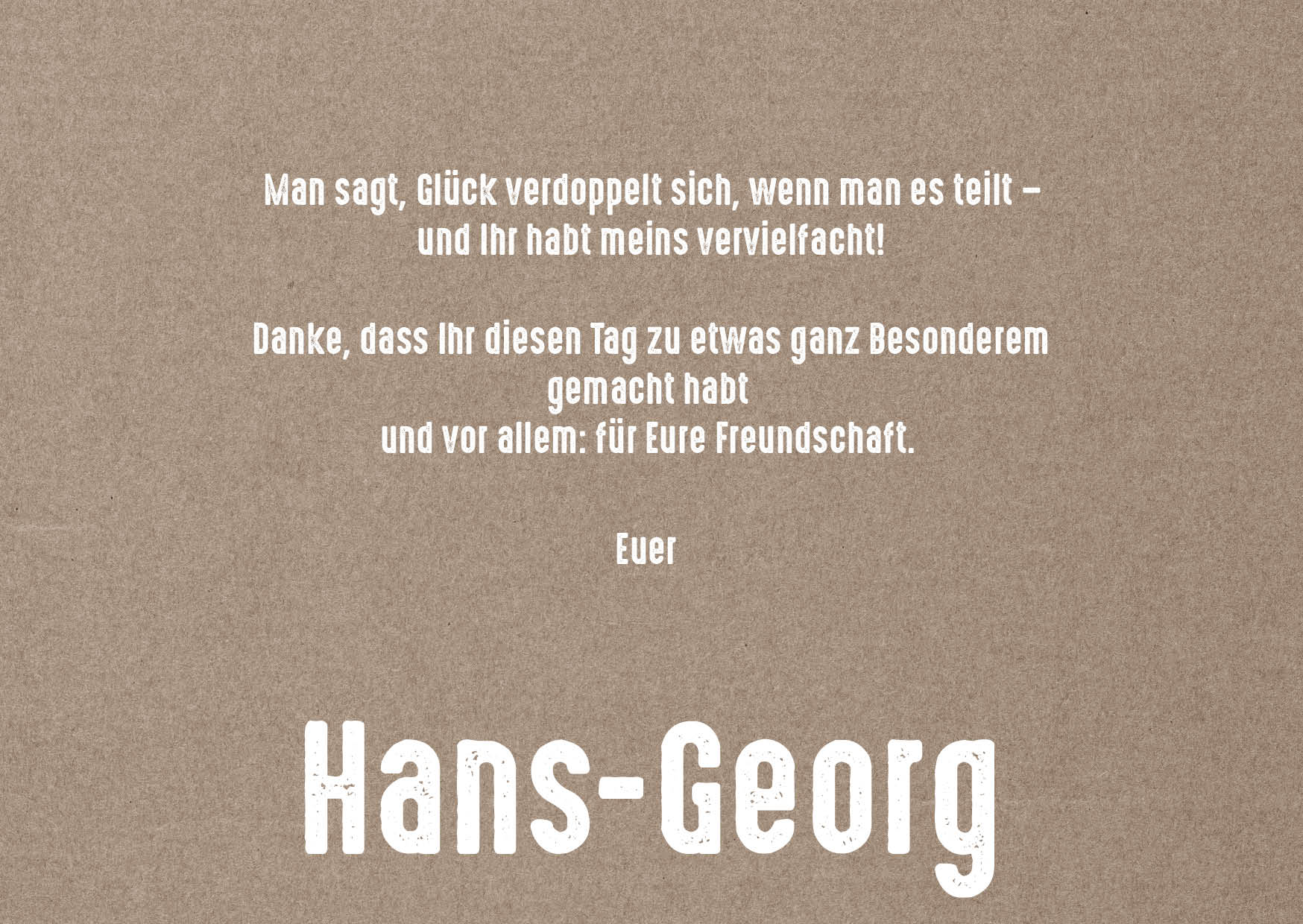 Unsere humorvolle Danksagungskarte zum Geburtstag in Rustikal bringt Dein „Danke“ genauso charmant rüber wie Du selbst: ehrlich, herzlich und mit einem Lächeln zwischen den Zeilen.