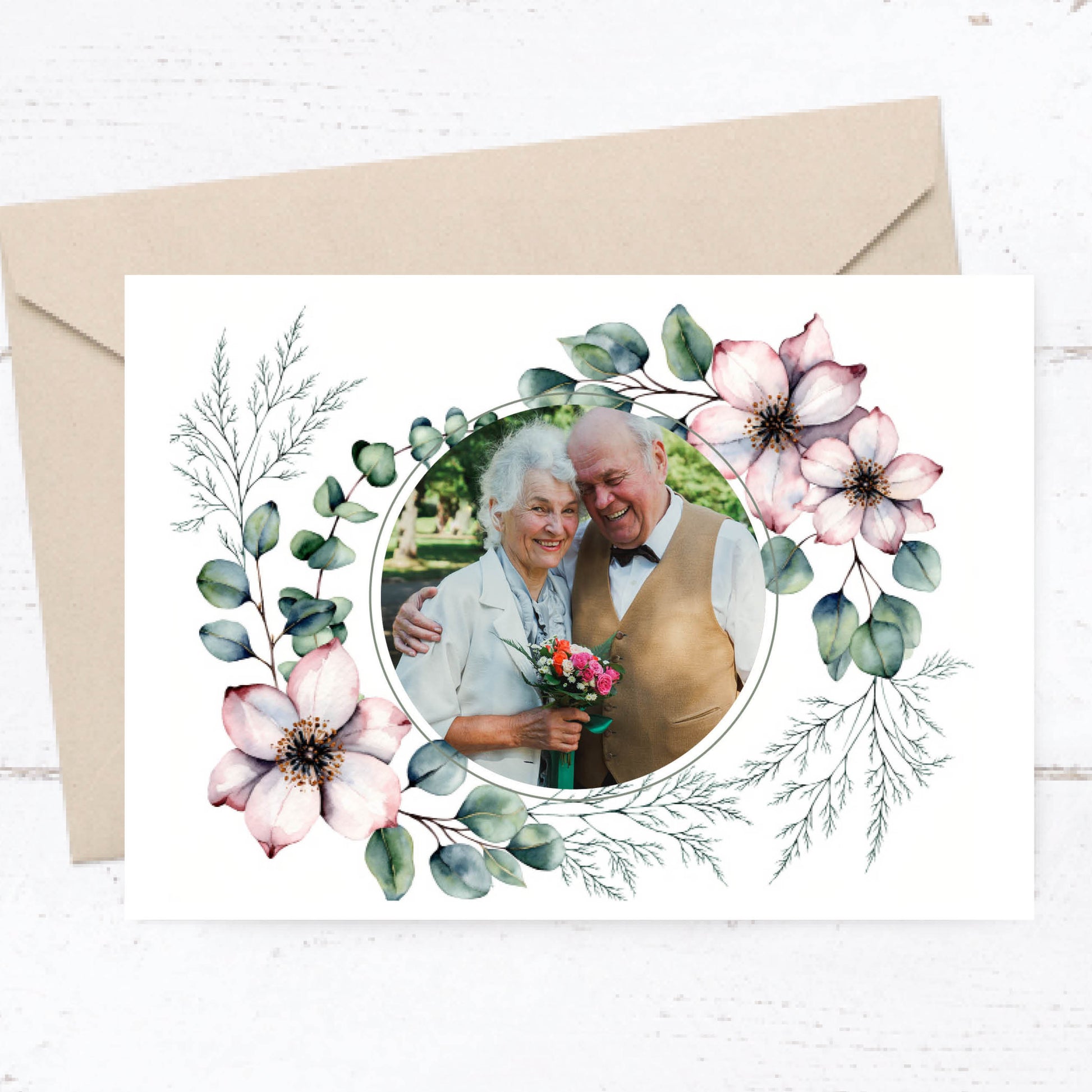 Danksagungskarte zur Goldenen Hochzeit: Romantische Blumen mit Foto