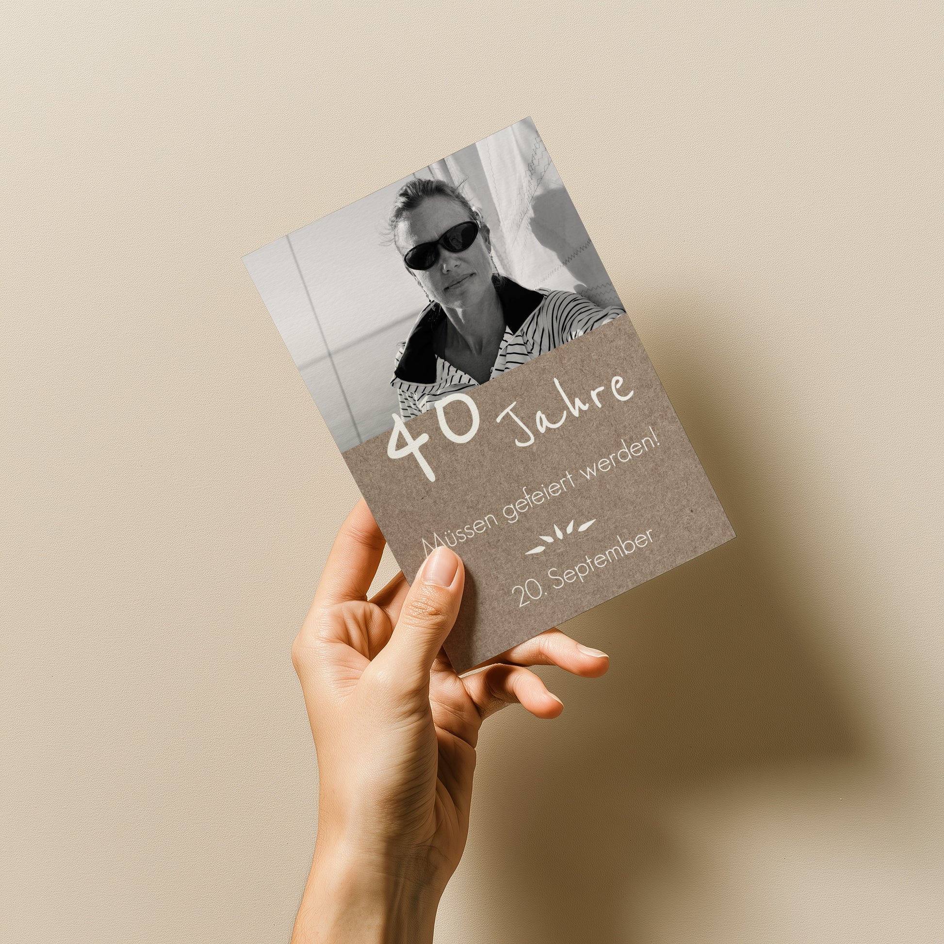Mit dieser rustikalen Einladung in Naturtönen und Deinem Lieblingsfoto zeigst Du, dass Reife und Lebensfreude wunderbar zusammenpassen.