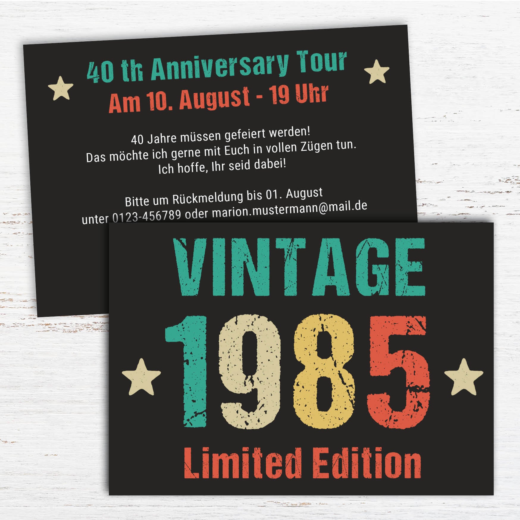 „Vintage 1985 – Limited Edition“ ist Deine Einladung für eine Party mit Stil, Augenzwinkern und jeder Menge Charakter.