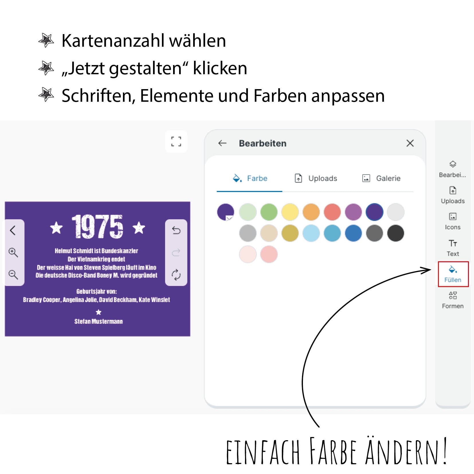 Einladungstexte mit Charme, kleinen Anekdoten oder Fun Facts aus 1975 machen aus dieser Karte mehr als nur einen Termin.