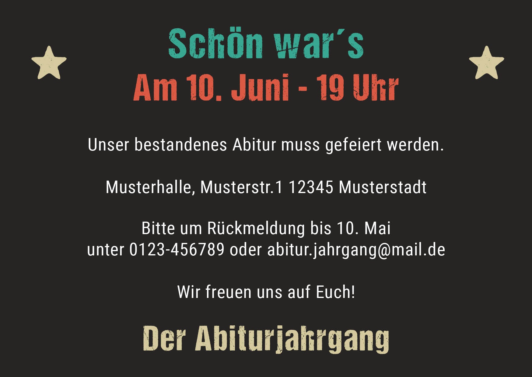 Gestaltet sie ganz einfach selbst und erhaltet sie schnell und kostenfrei geliefert. Lasst Euch von unserem einzigartigen Design verzaubern und sichert Euch eine Einladung, die Euren Abiball unvergesslich macht! Ihr könnt die Vorlage auch gut als Abiball Eintrittskarte verwenden.