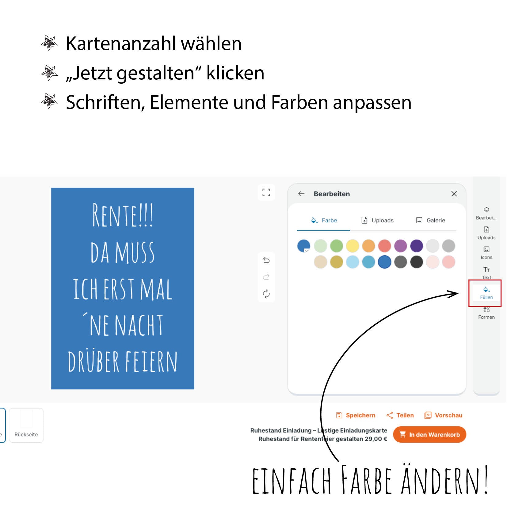 Lade Freunde und Familie zu deiner Ruhestand- oder Rentenparty ein und bereite ihnen mit der Einladung eine Überraschung! Gestalte sie online nach Deinen Wünschen: Farben, Schriftarten und Sprüche anpassen! Schnelle, kostenlose Lieferung inklusive. Einfach online selbst gestalten oder von uns gestalten lassen.