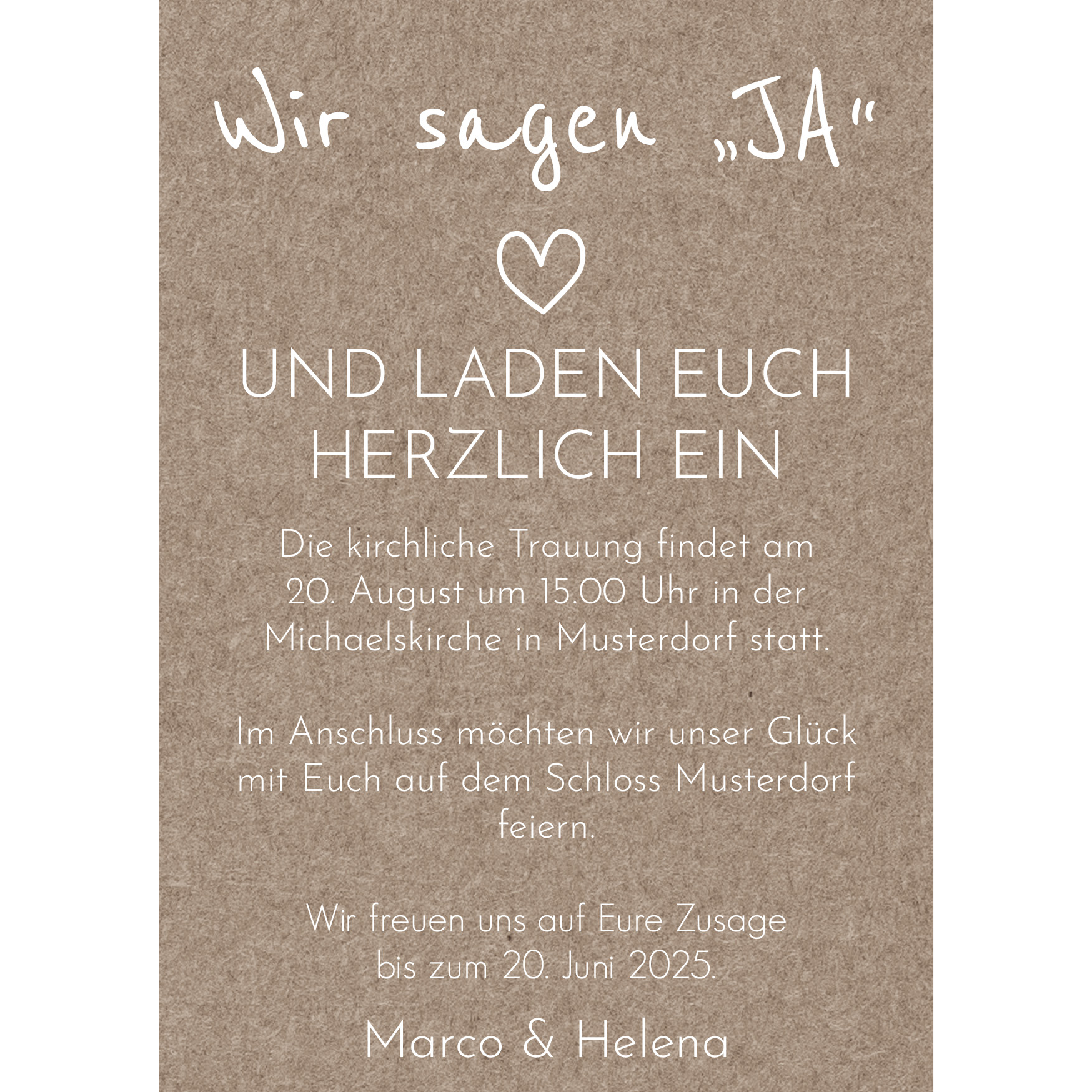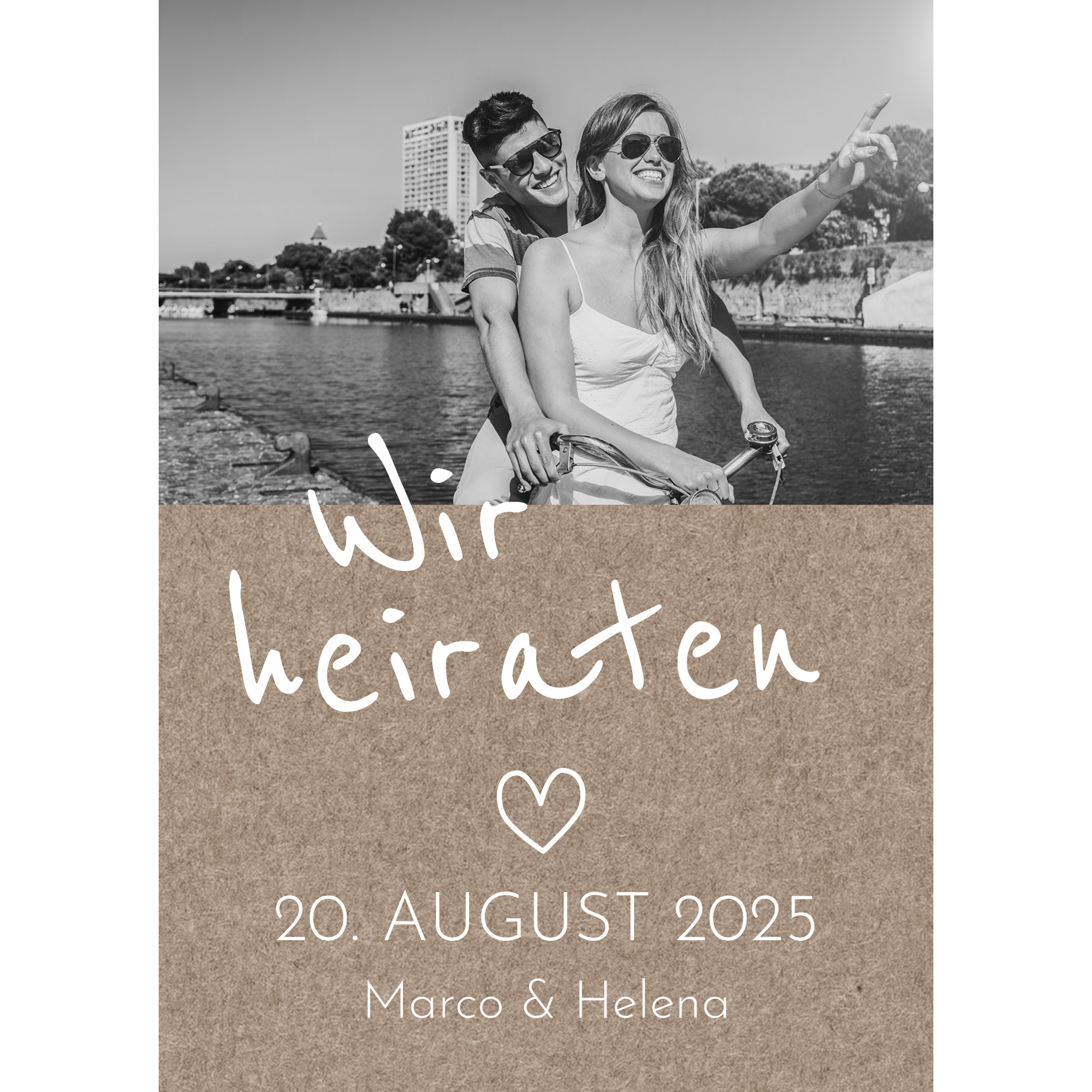 Hochzeitseinladung im Postkartenformat. Auf der Vorderseite ist Platz für ein Foto von Euch Besonders schön wirken Schwarz/Weiß Fotos in der Kombination mit der Kraftpapier Optik. Dein Foto kannst Du ganz leicht im Editor hochladen und umfärben.