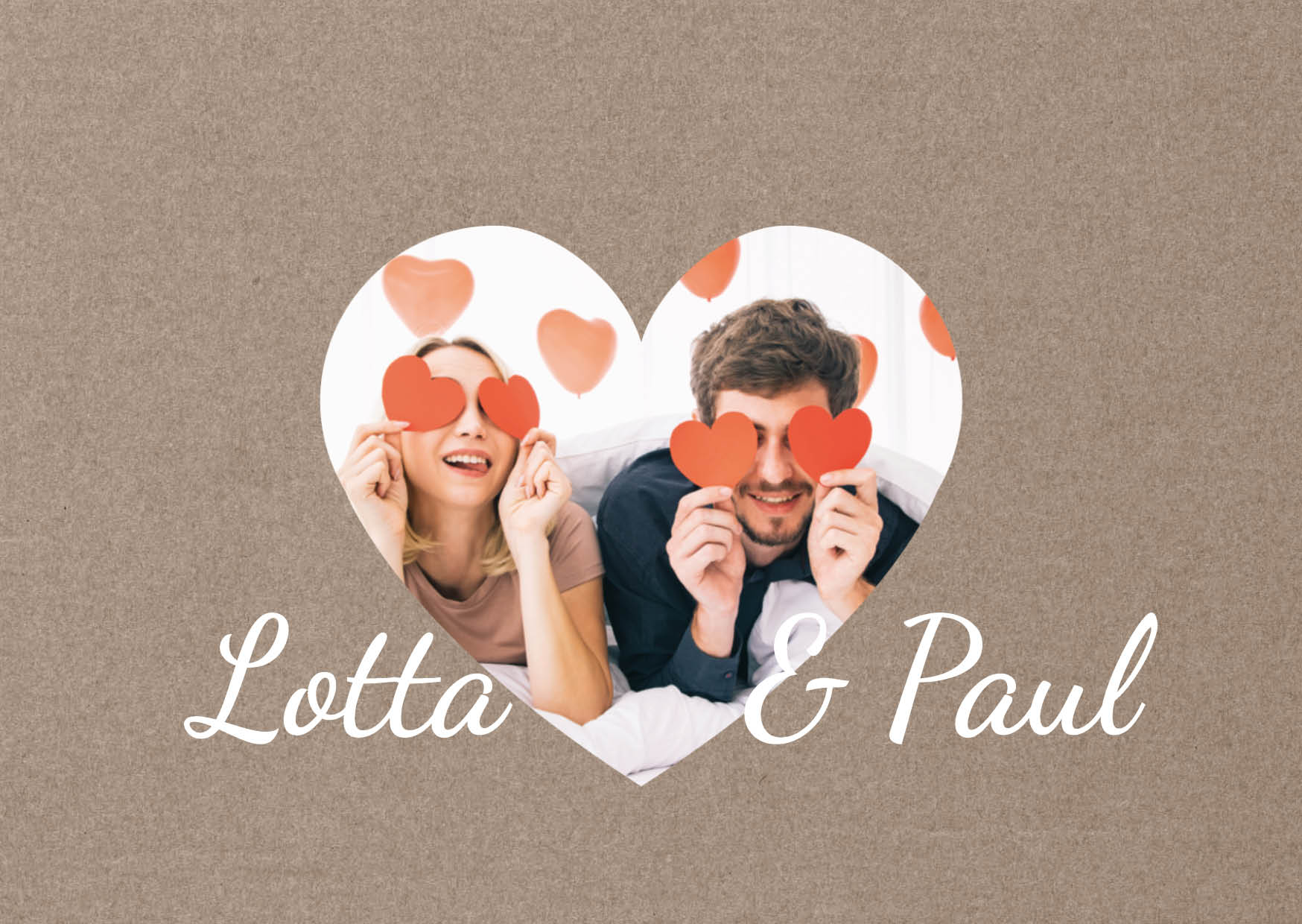 Mit dieser Hochzeitseinladung in stylischer Kraftpapier-Optik und Deinem Lieblingsfoto in Herzform wird’s richtig persönlich – und wunderschön rustikal.