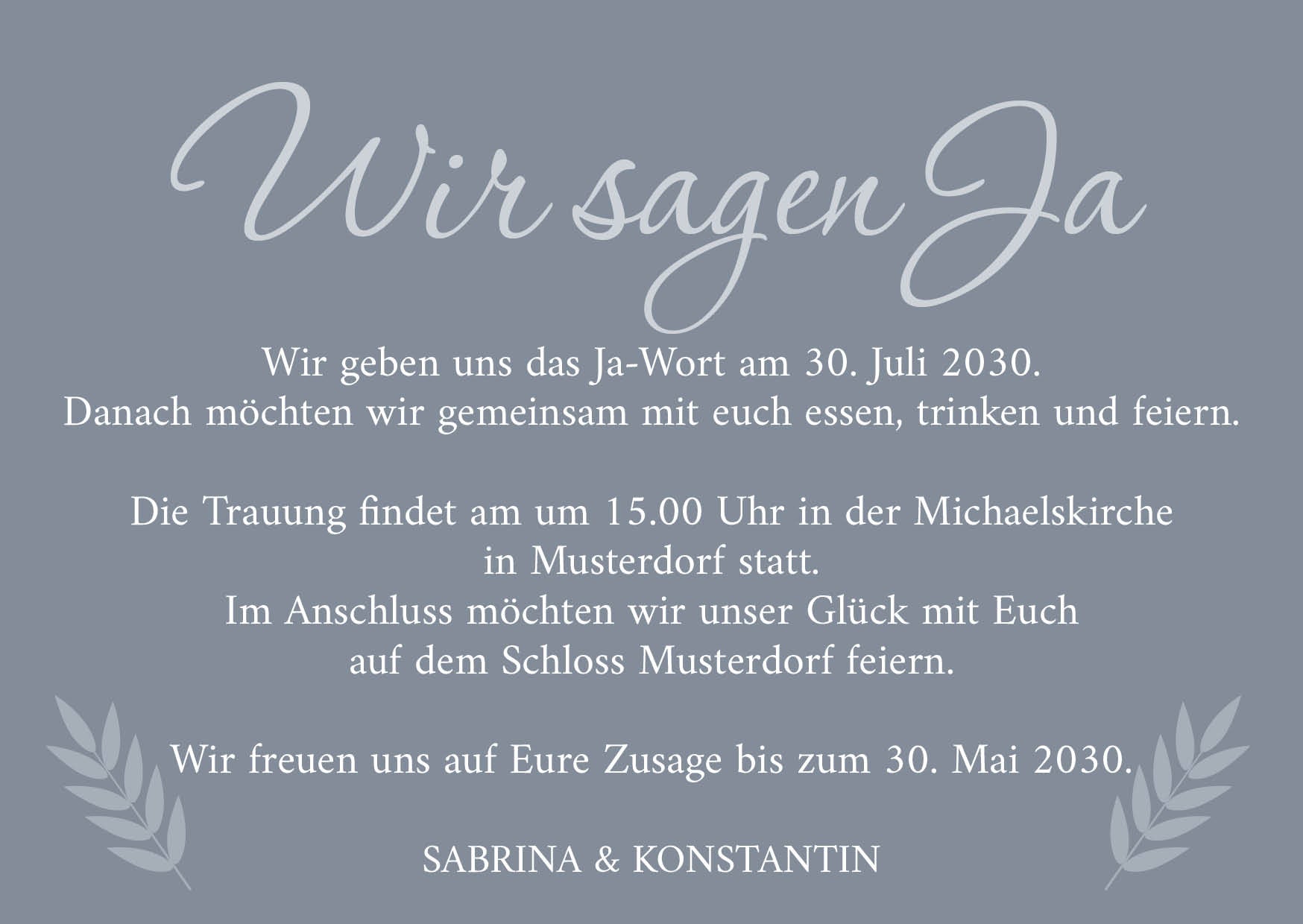 Gebe einfach Deinen gewünschten Text und Änderungswünsche in dem Textfeld im Warenkorb ein. Nach Bestelleingang stimmen wir den Entwurf mit Dir ab, bis Du uns die Druckfreigabe erteilst.