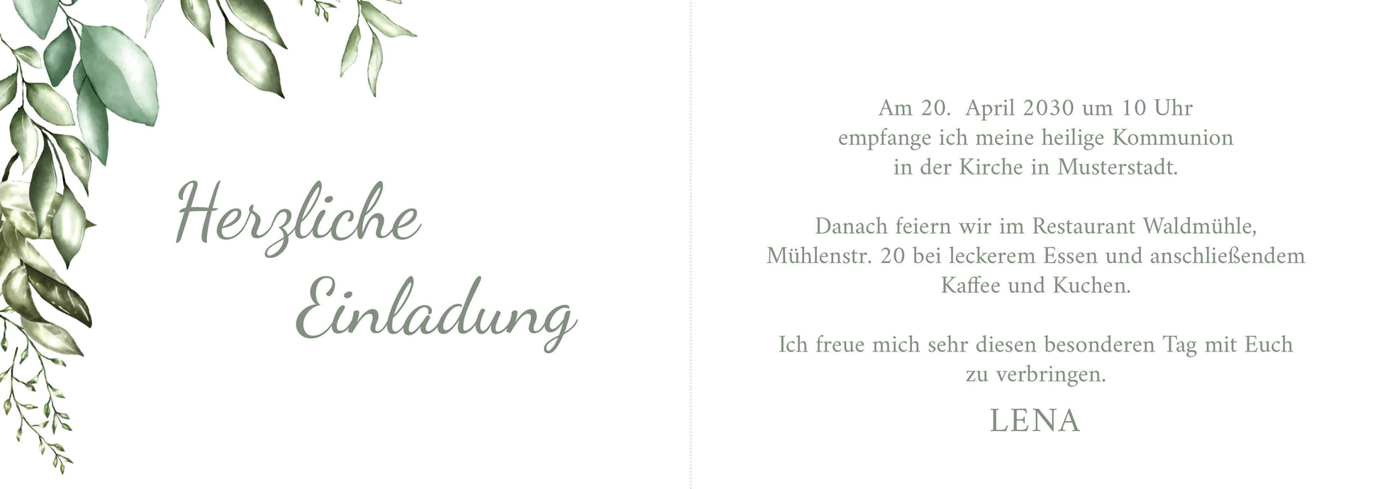 Die Kommunion ist ein ganz besonderer Tag – ein feierlicher Moment, der Glaube, Familie und Zukunft miteinander verbindet. Mit unserer Einladungskarte „Greenery“ unterstreichst Du genau diese Werte: Natürlichkeit, Aufbruch und Hoffnung. Zarte Blätter und filigrane Zweige verleihen dem Design Leichtigkeit und Wärme – passend zu einem jungen Menschen, der seinen Weg im Glauben beginnt.