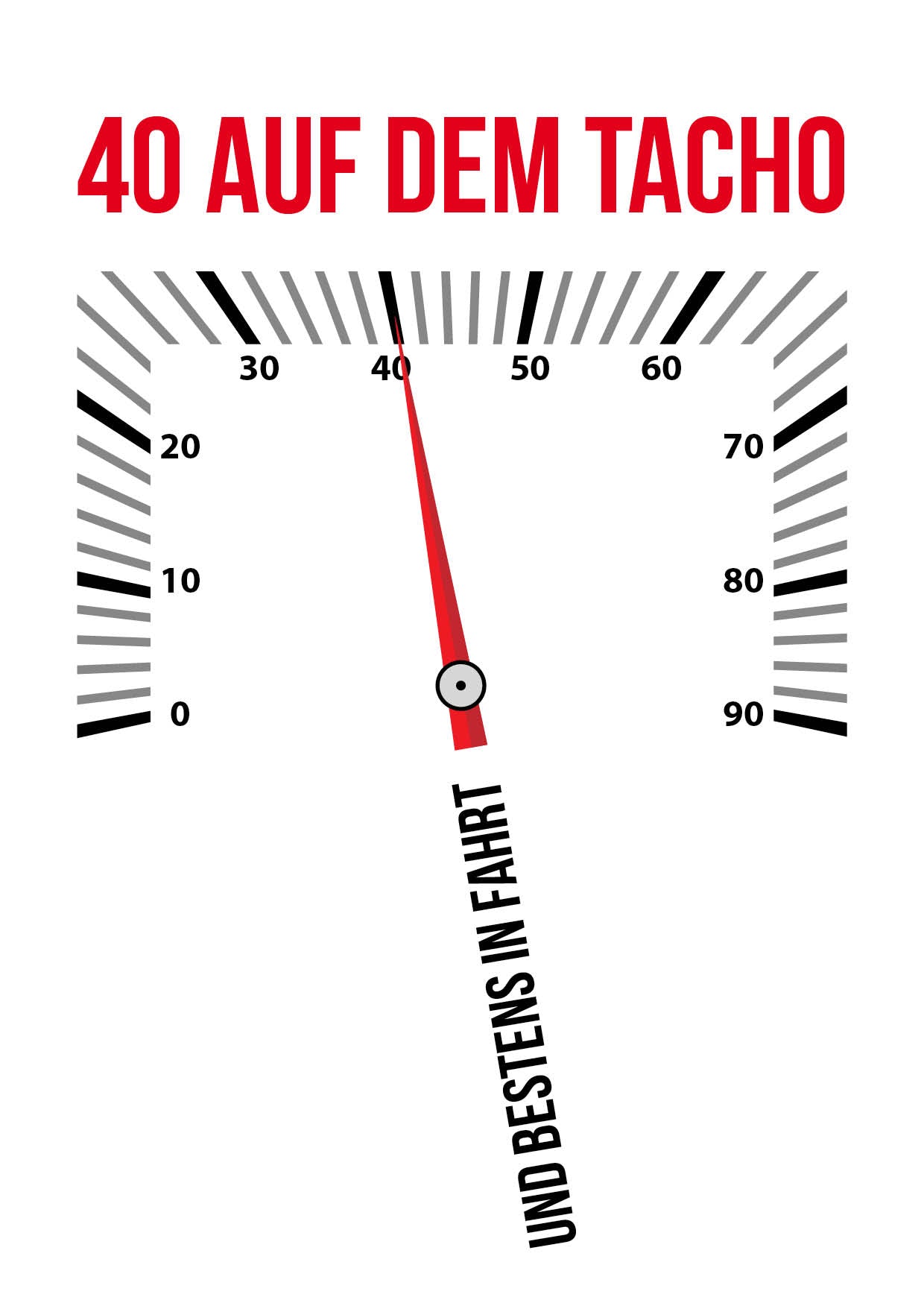 Glückwunsch Postkarte zum 40. Geburtstag – 40 auf dem Tacho… und bestens in Fahrt